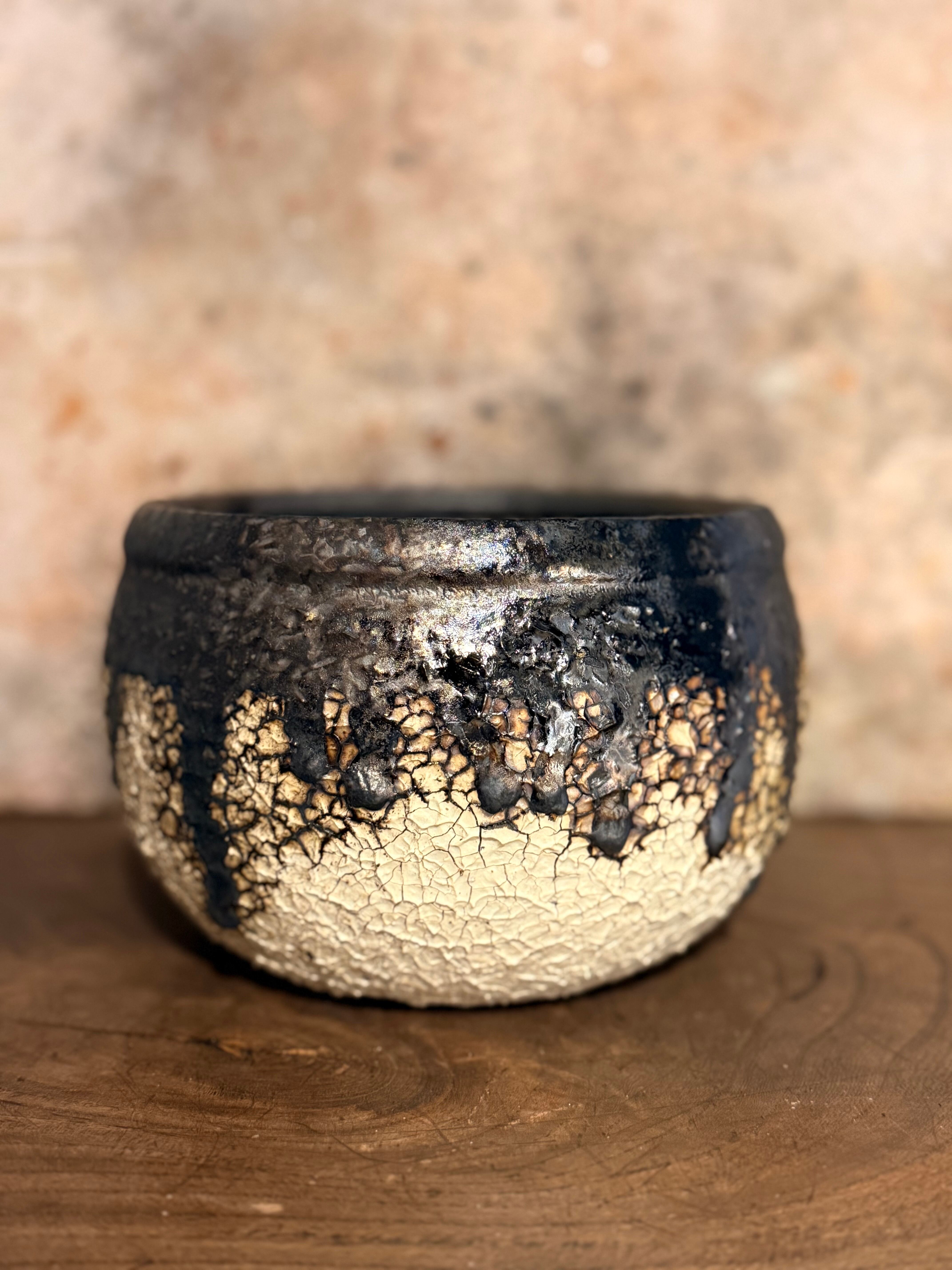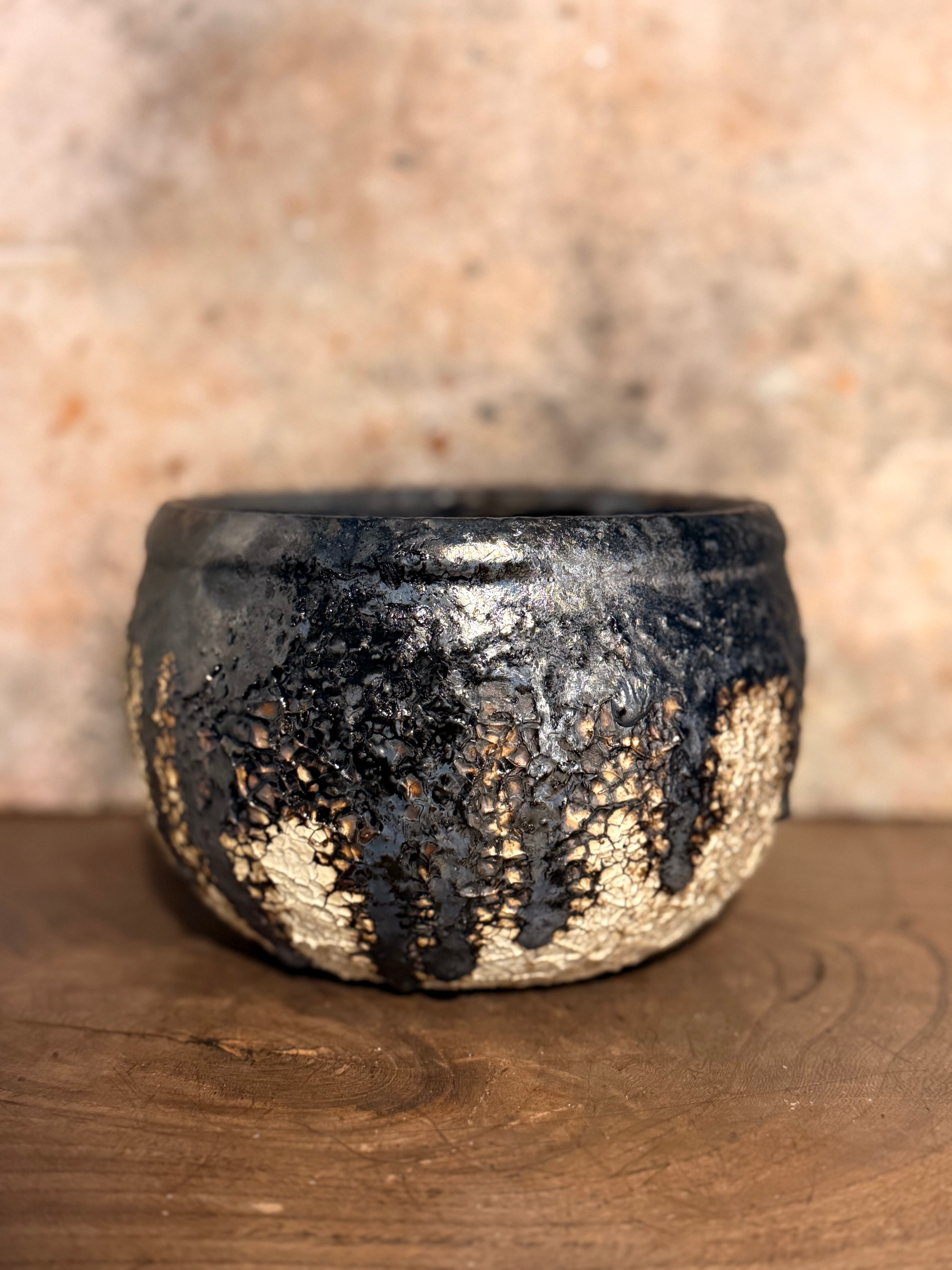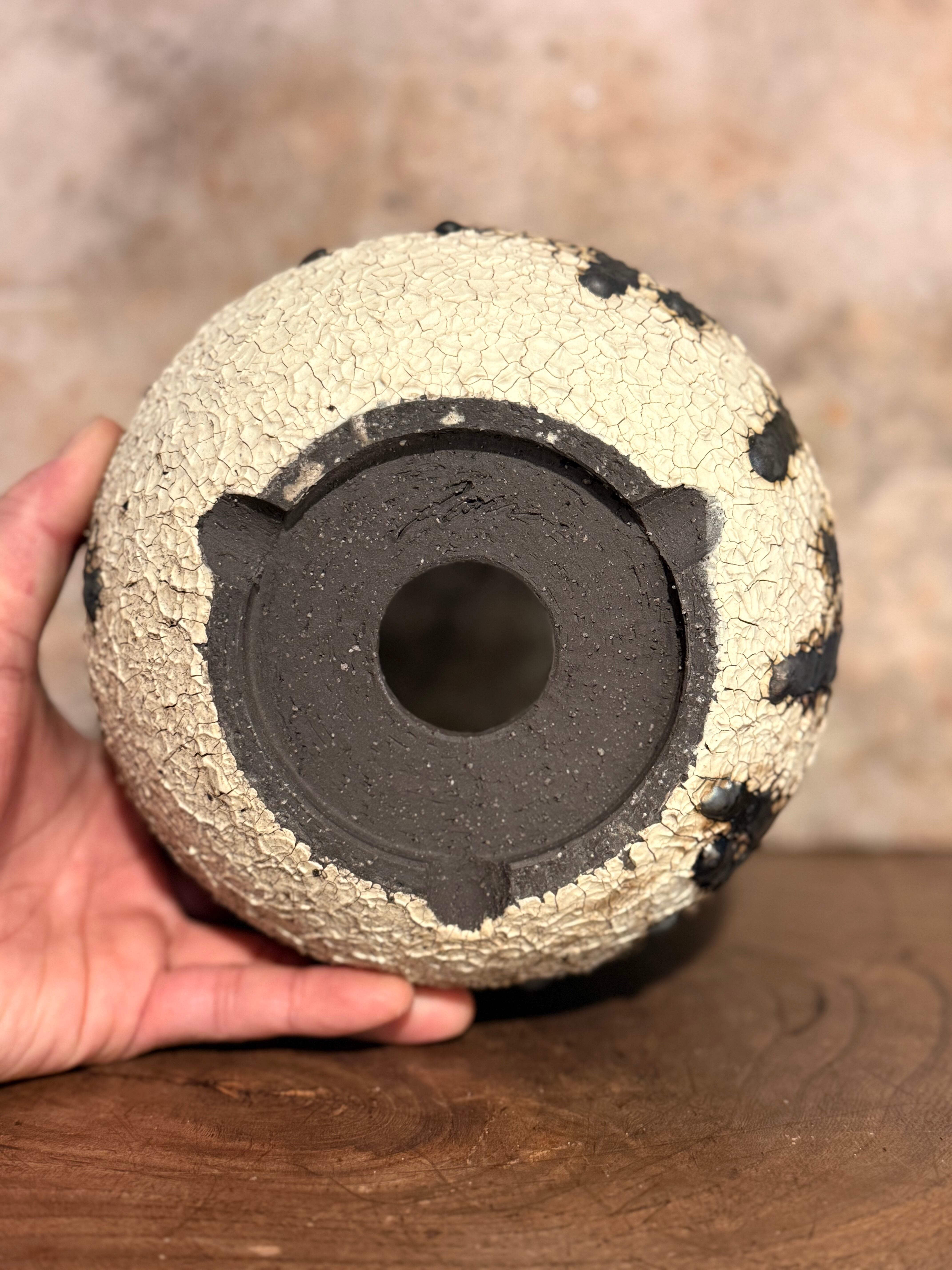 釉薬が下に垂れたり、色が変化しているこの表現は人口的なモノでは無く、人の手が届かない高温の炎の中で生まれ完成を迎えます。植物も光、風、水を元に成長していきますが、同じく人間が関与出来ないところが沢山あり、その共通点、面白さに焦点を当てる事により植物と陶芸は違う分野でも1つの作品として同じ意味を持てるのではないかと思い製作しました。