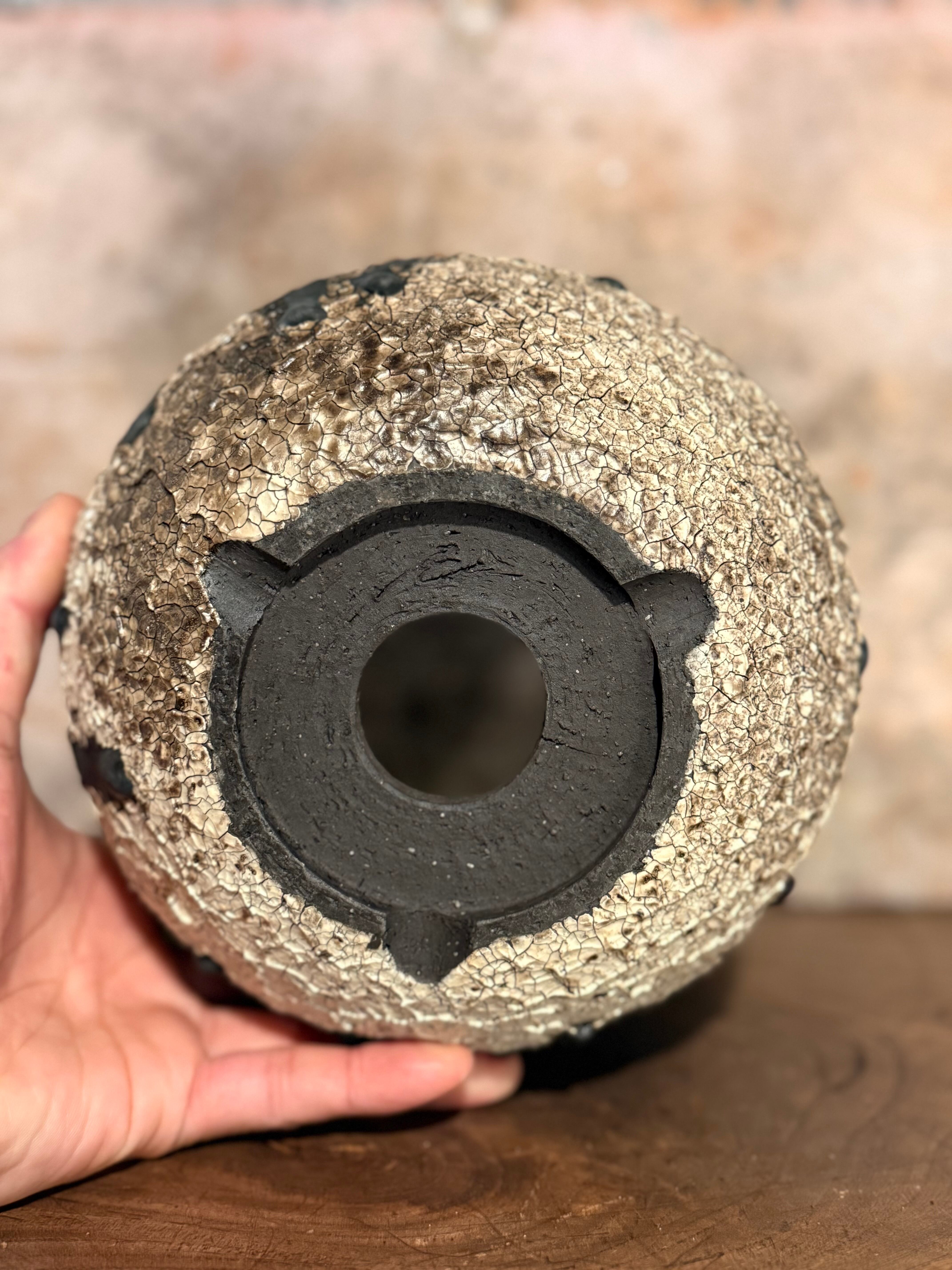 釉薬が下に垂れたり、色が変化しているこの表現は人口的なモノでは無く、人の手が届かない高温の炎の中で生まれ完成を迎えます。植物も光、風、水を元に成長していきますが、同じく人間が関与出来ないところが沢山あり、その共通点、面白さに焦点を当てる事により植物と陶芸は違う分野でも1つの作品として同じ意味を持てるのではないかと思い製作しました。