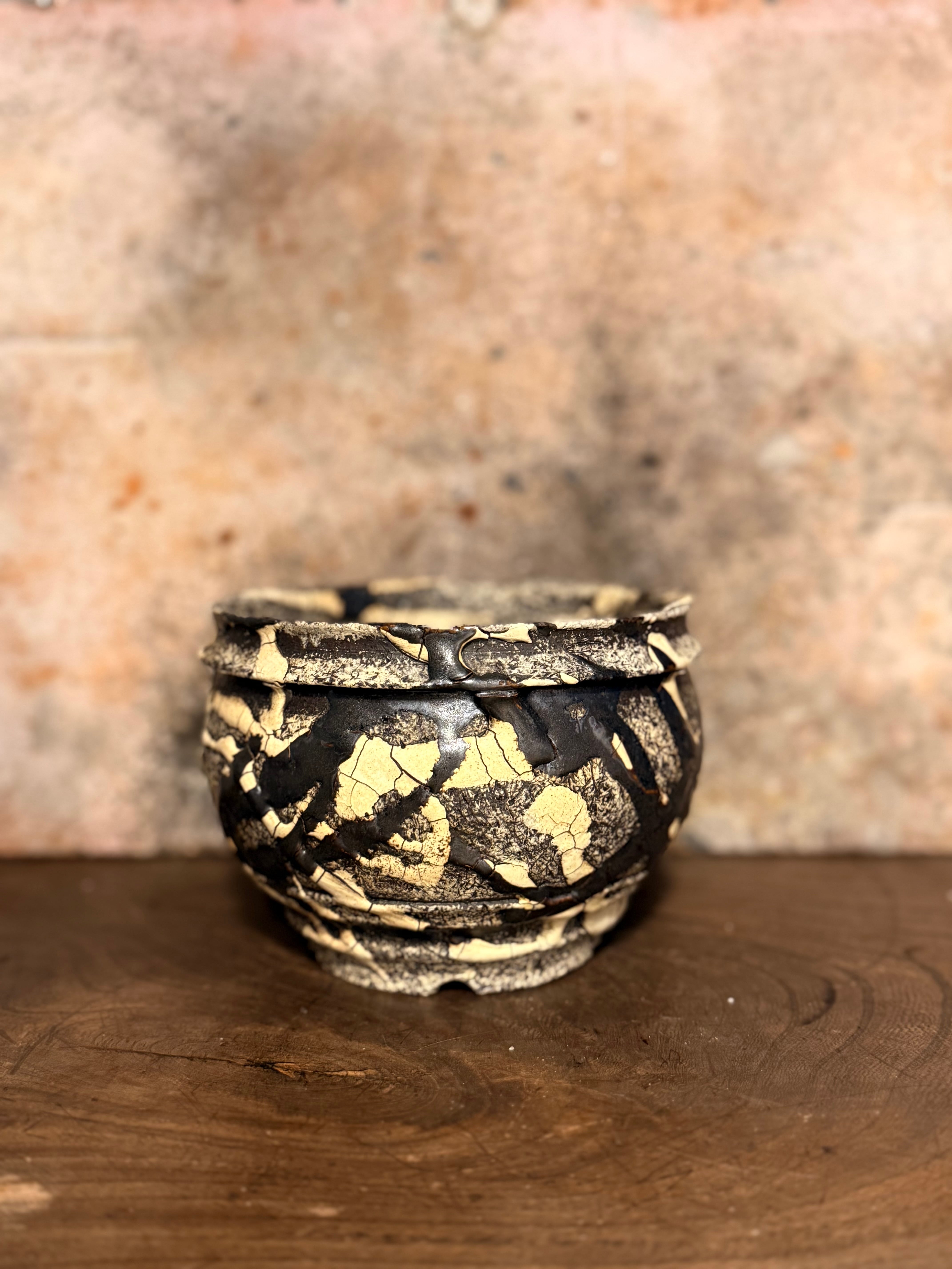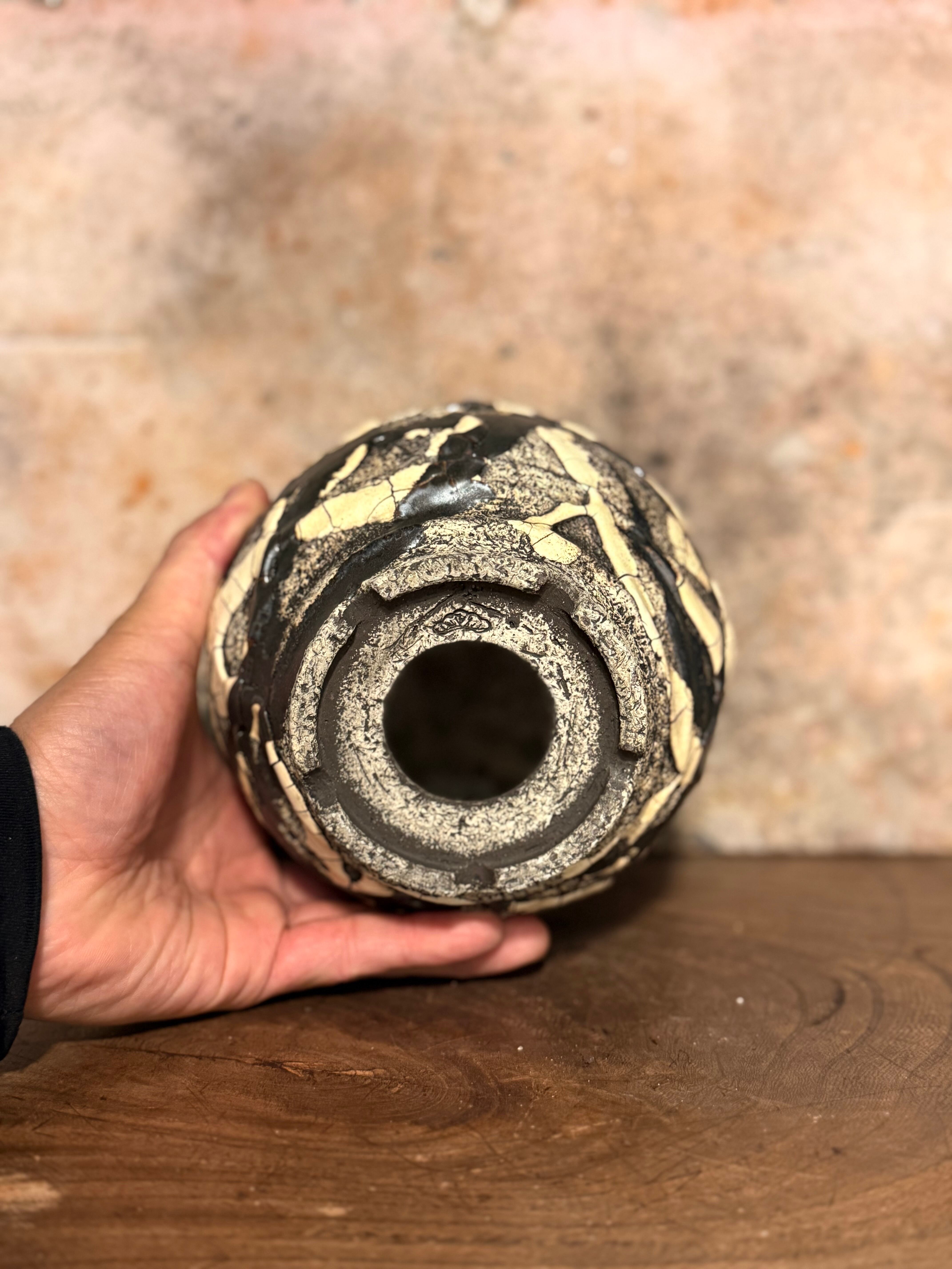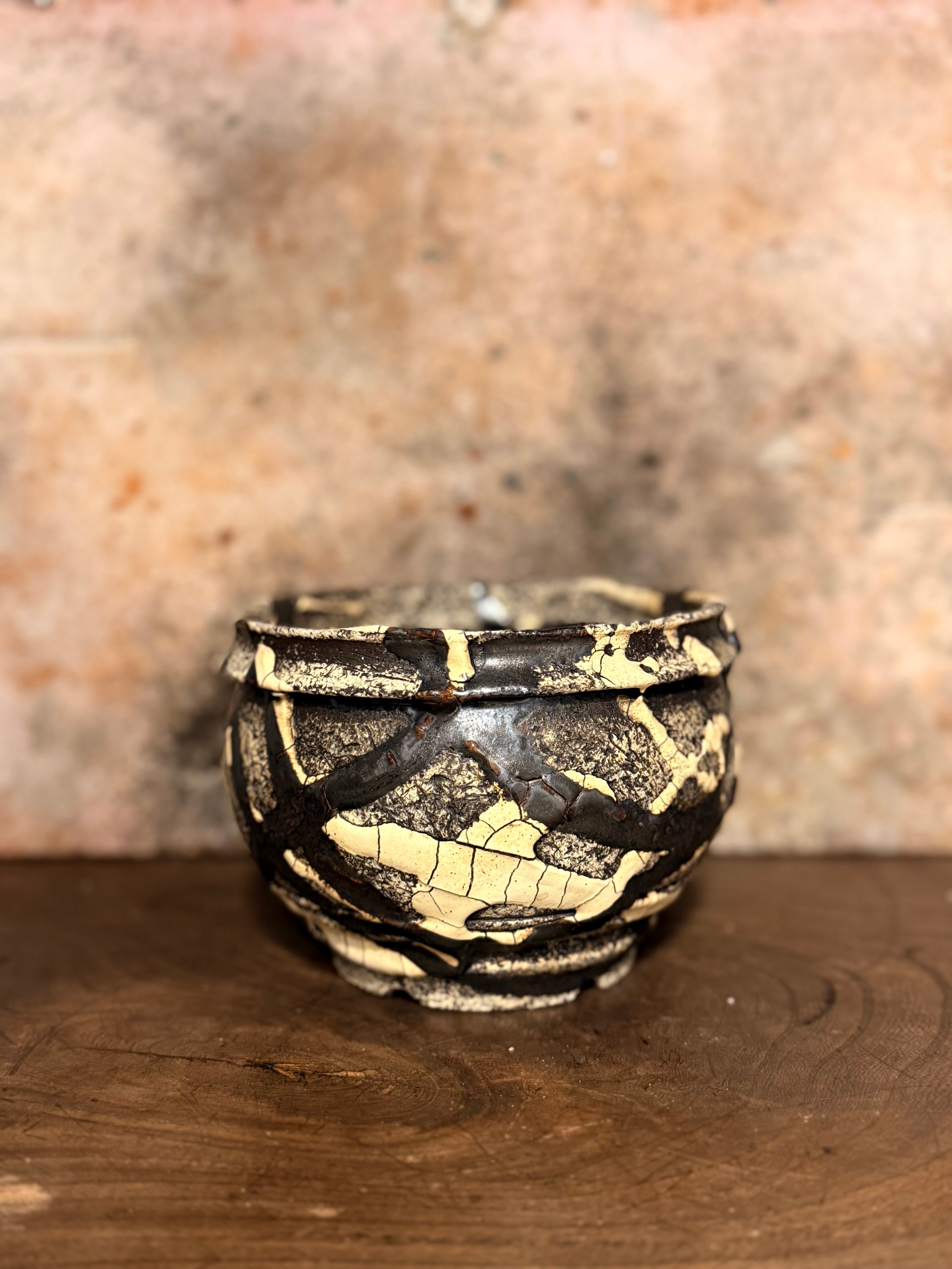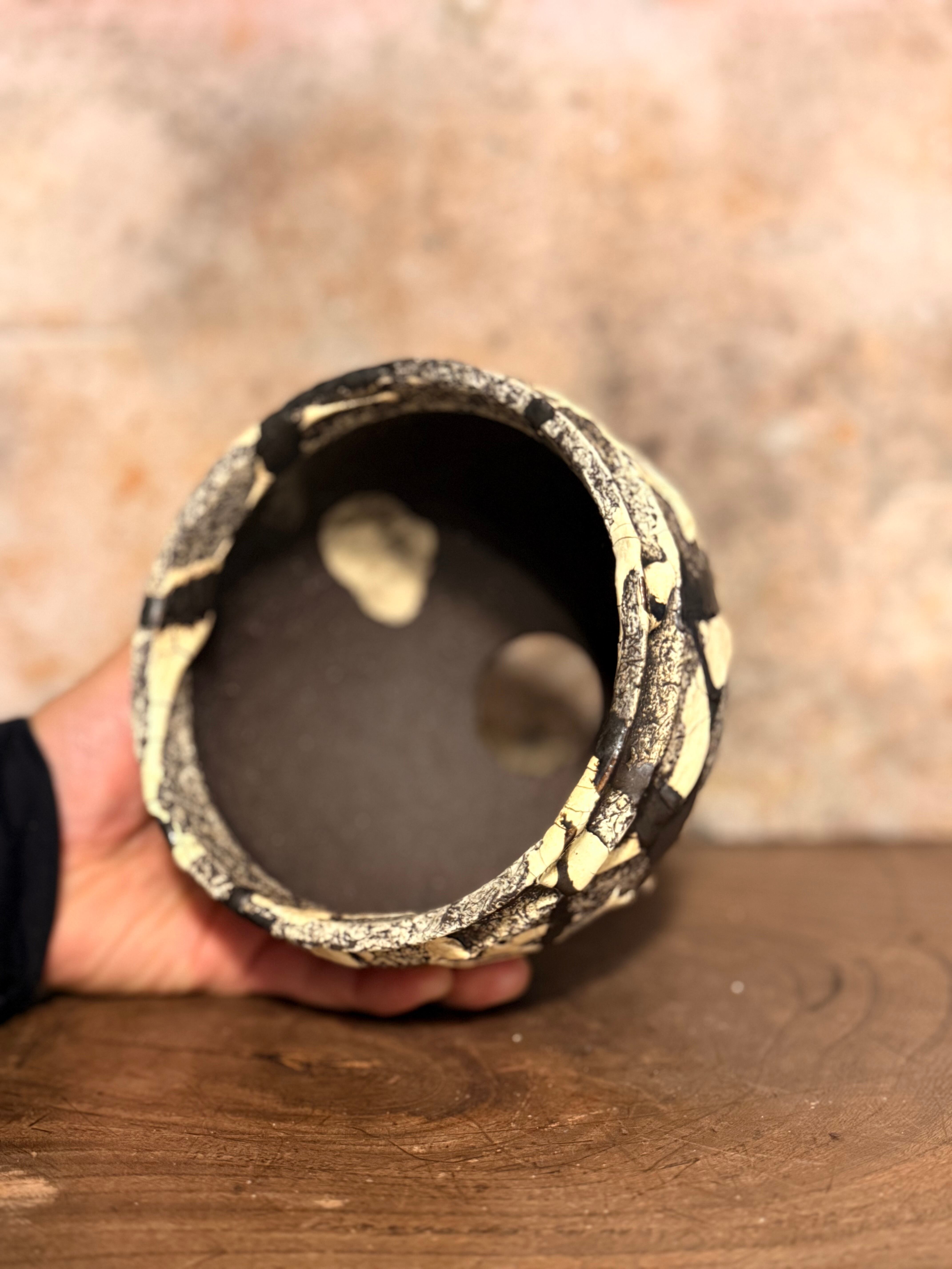 白と黒の釉薬を折り重ねて「蔓-kazura-」を表現しました。