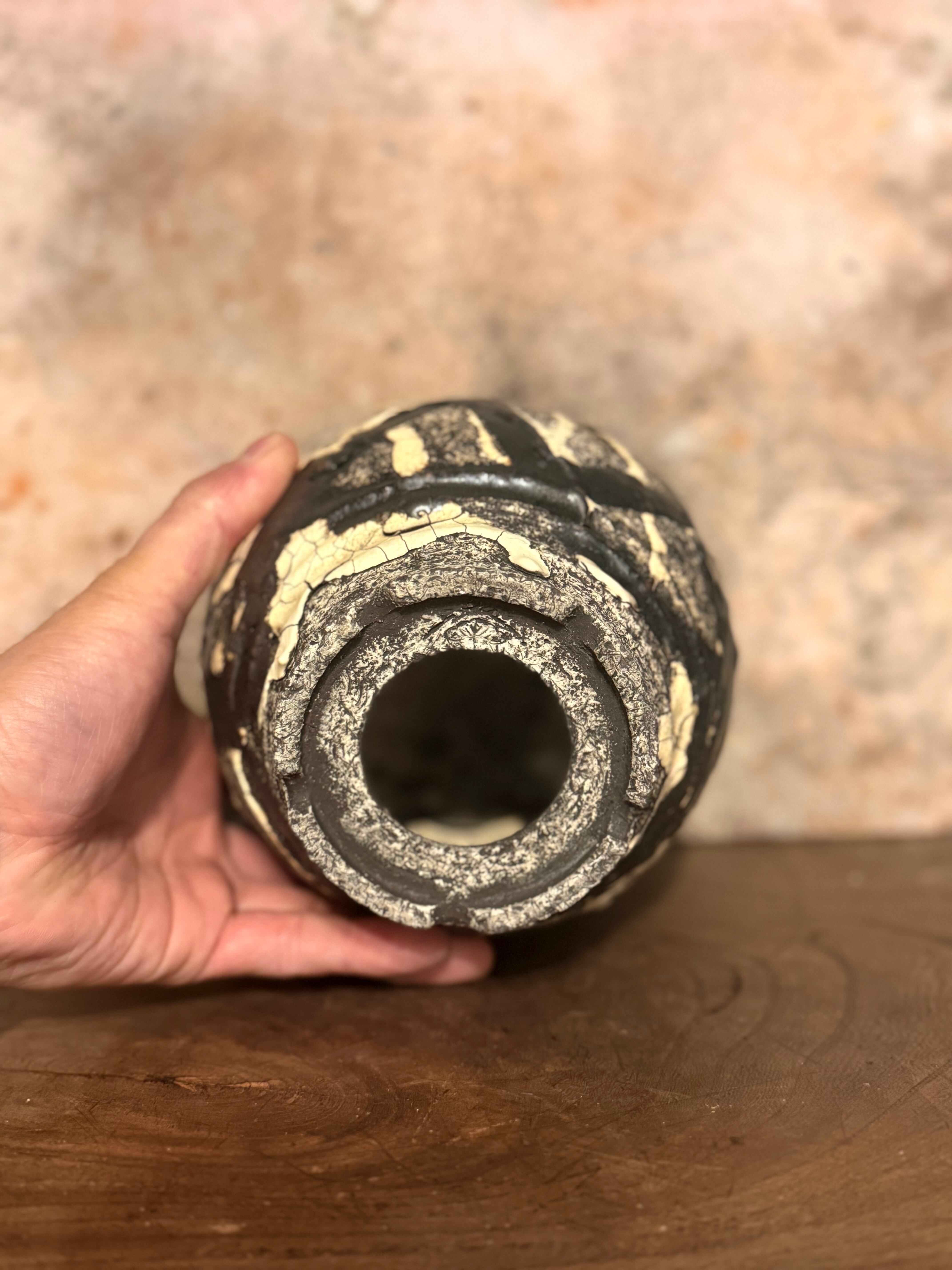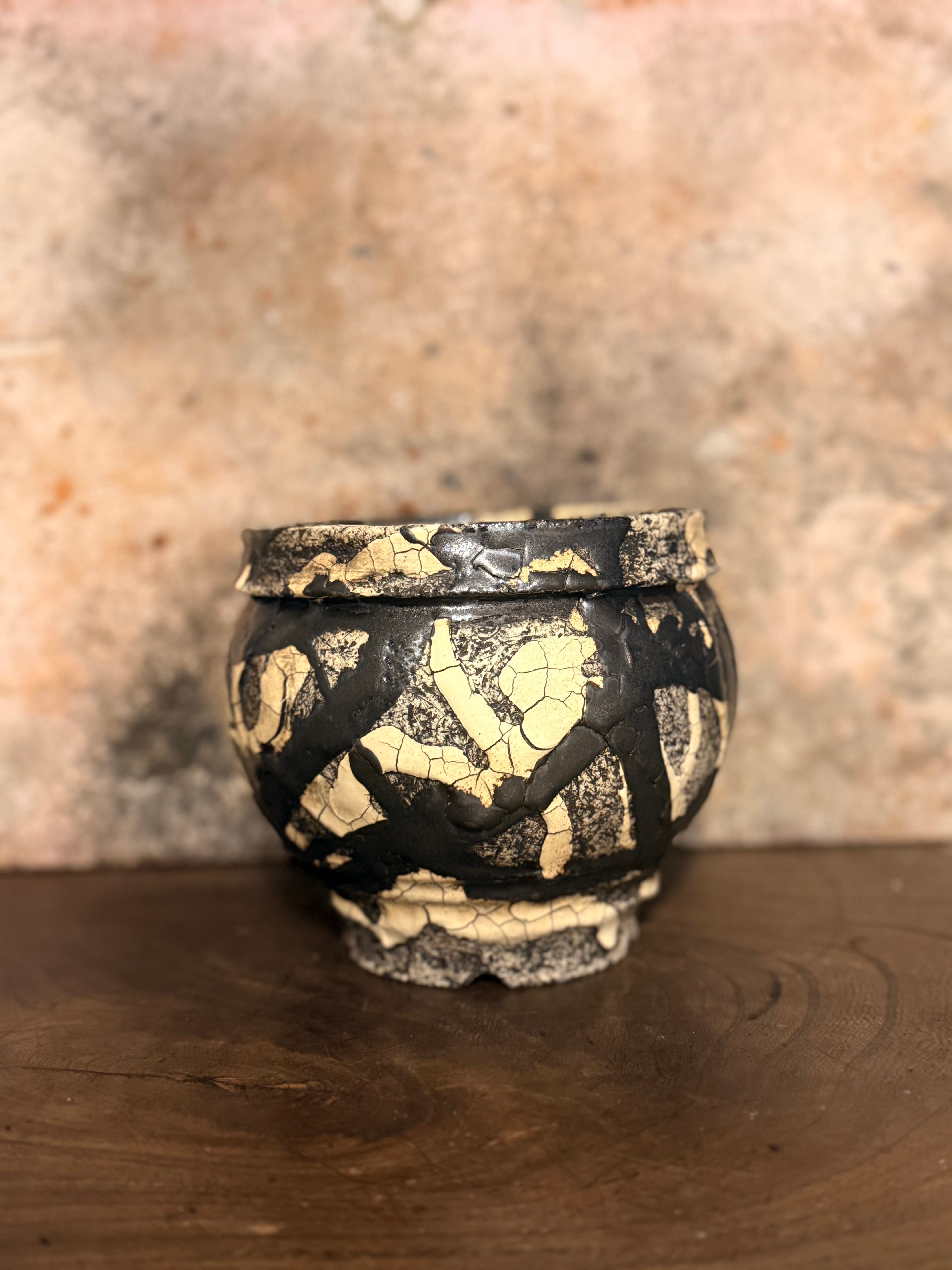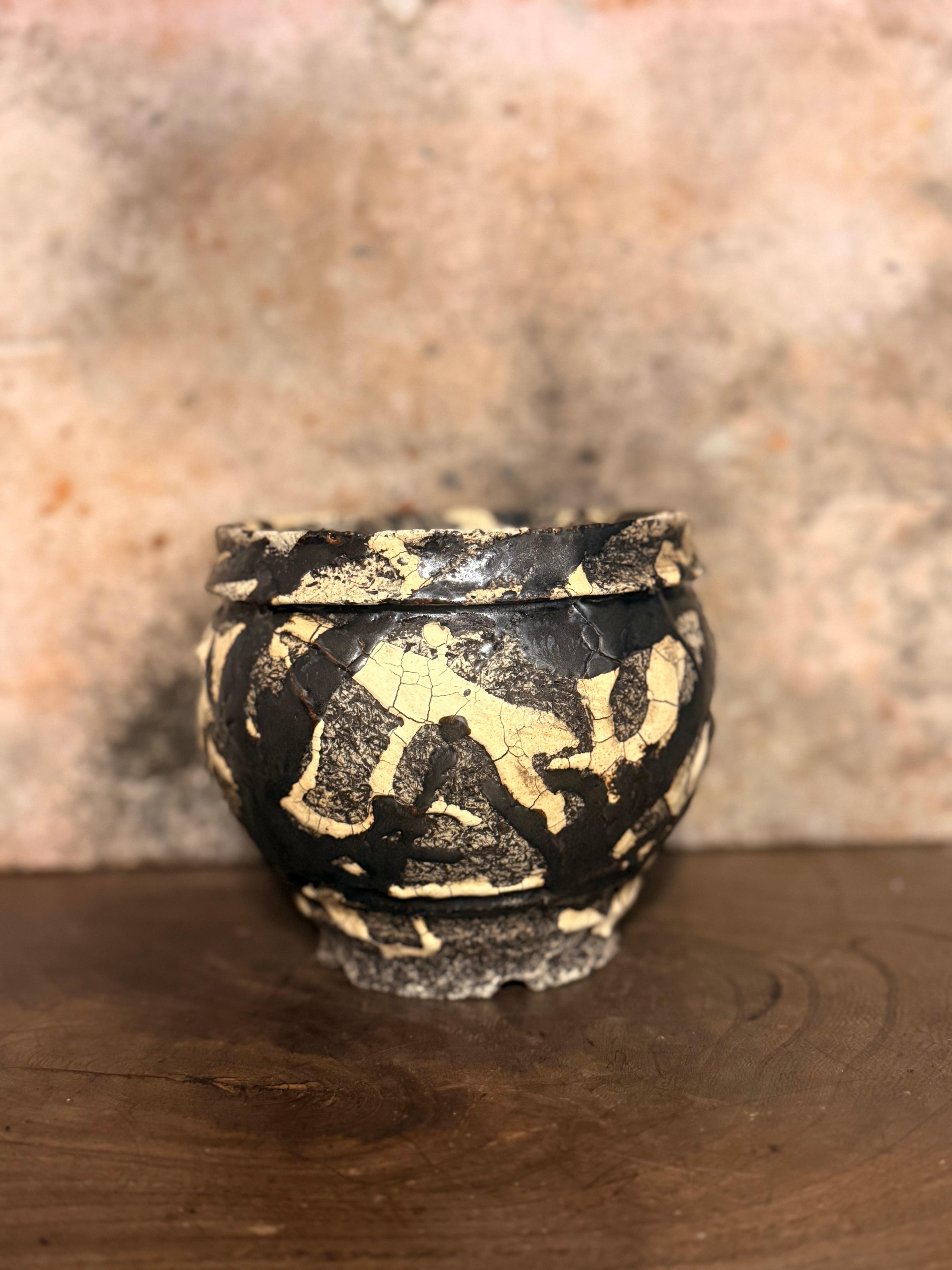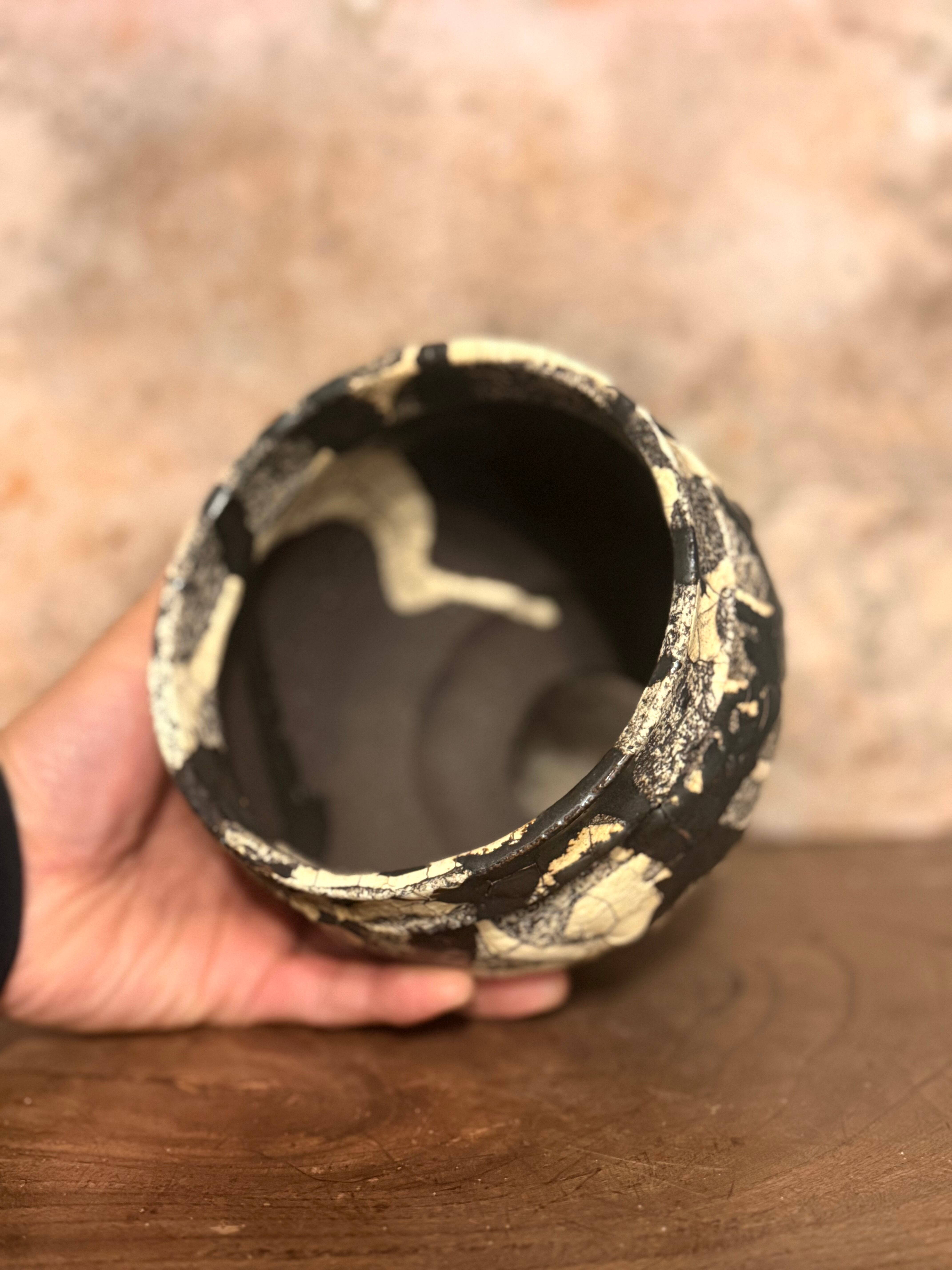 白と黒の釉薬を折り重ねて「蔓-kazura-」を表現しました。