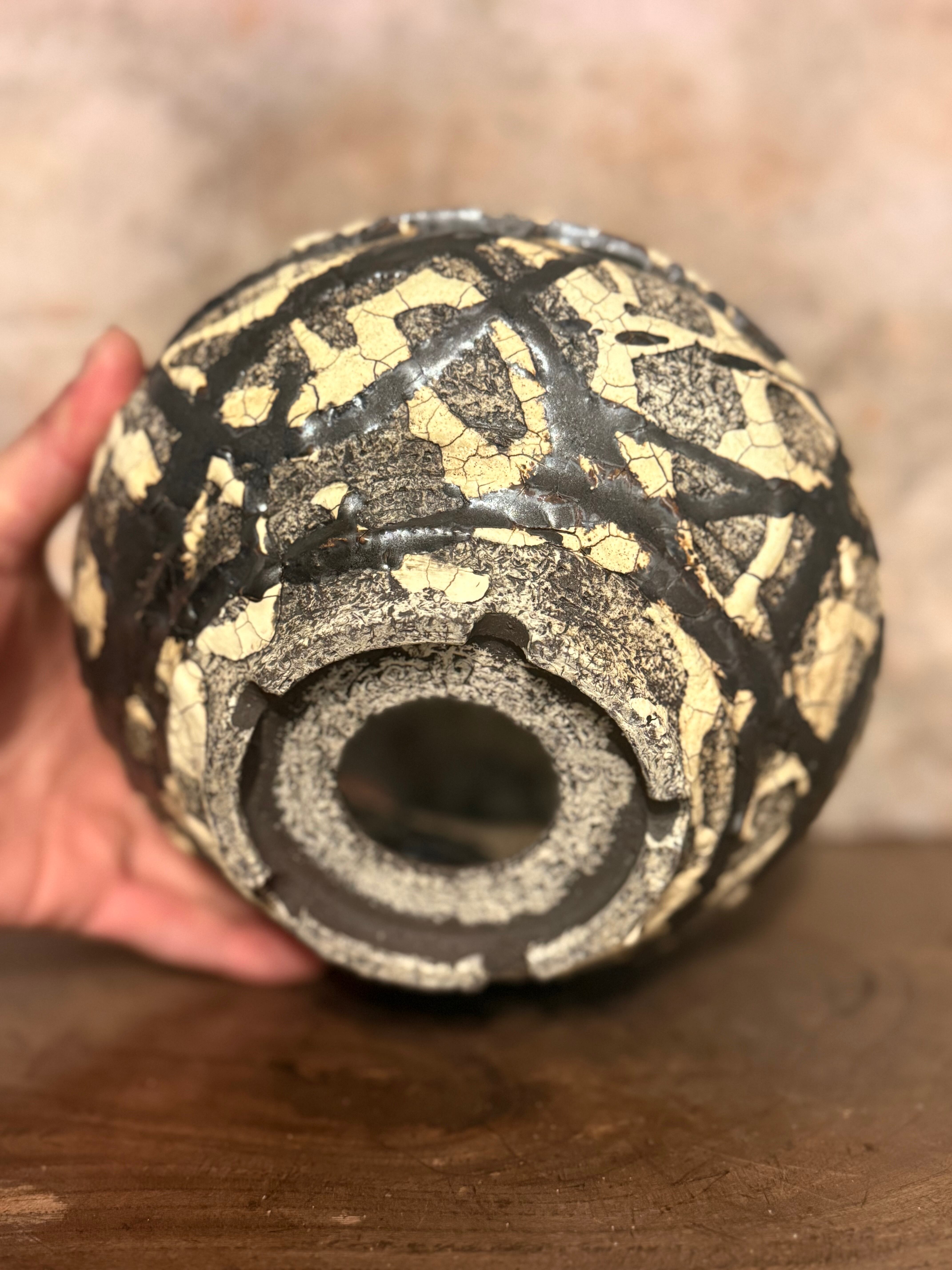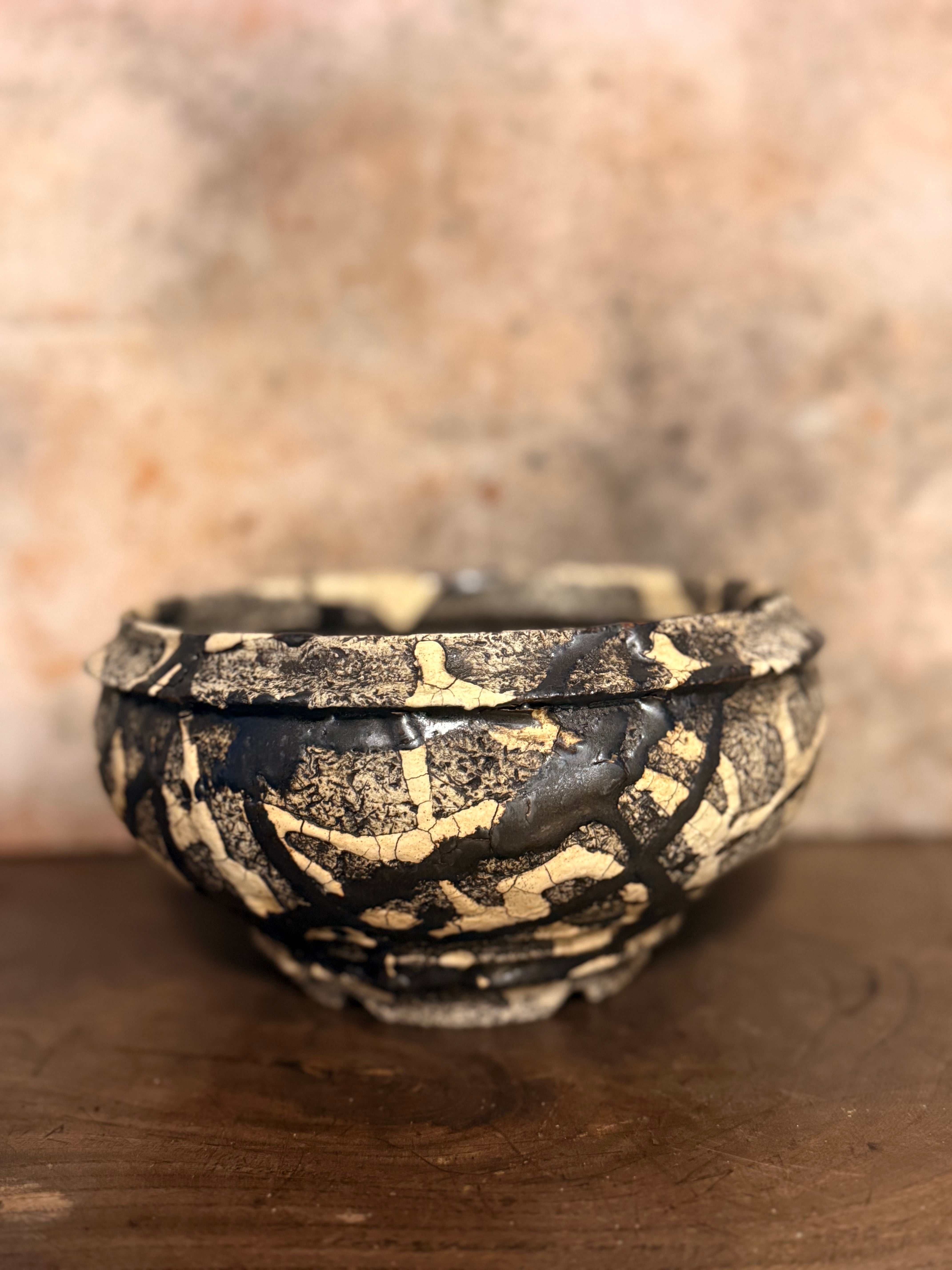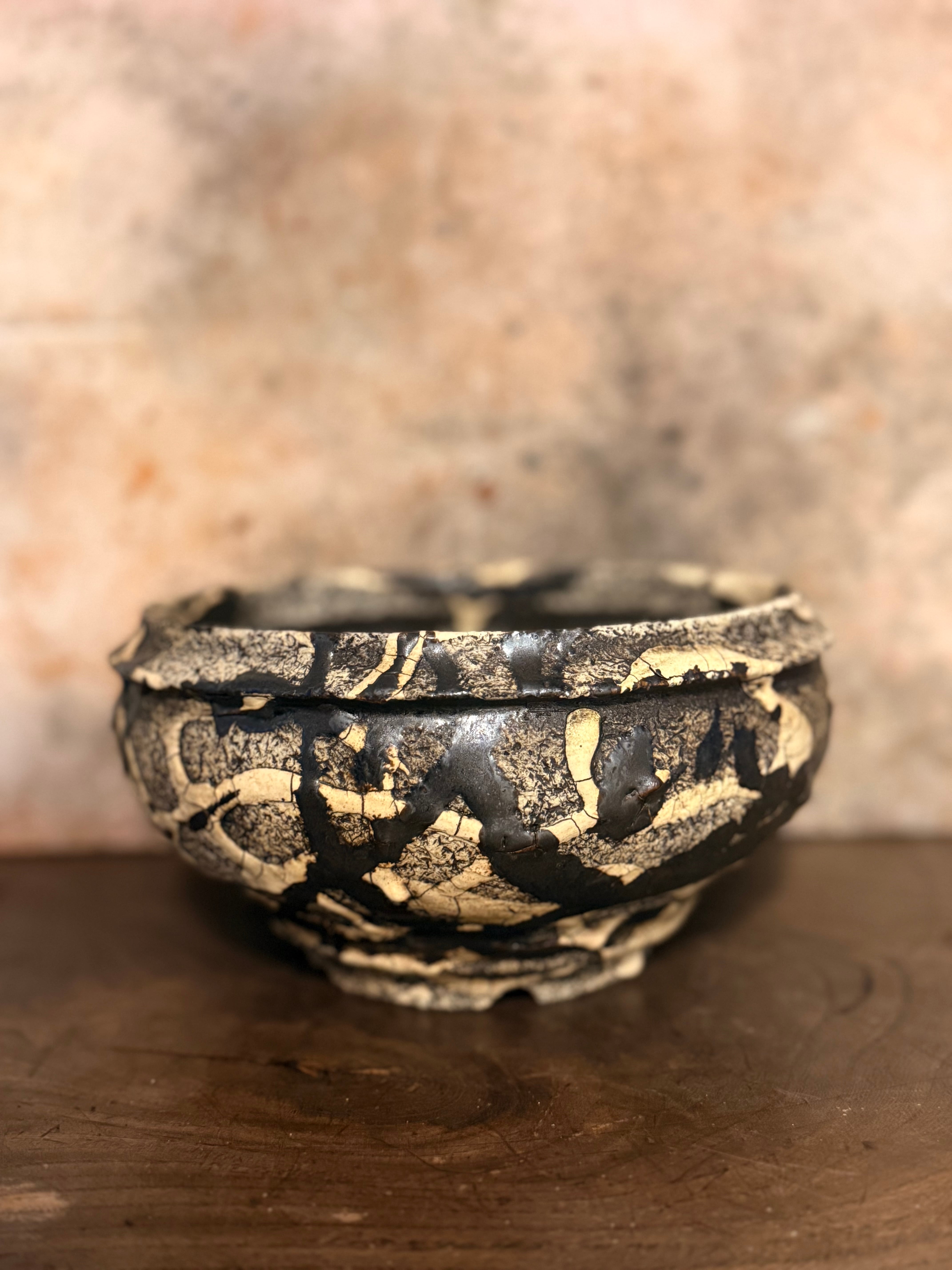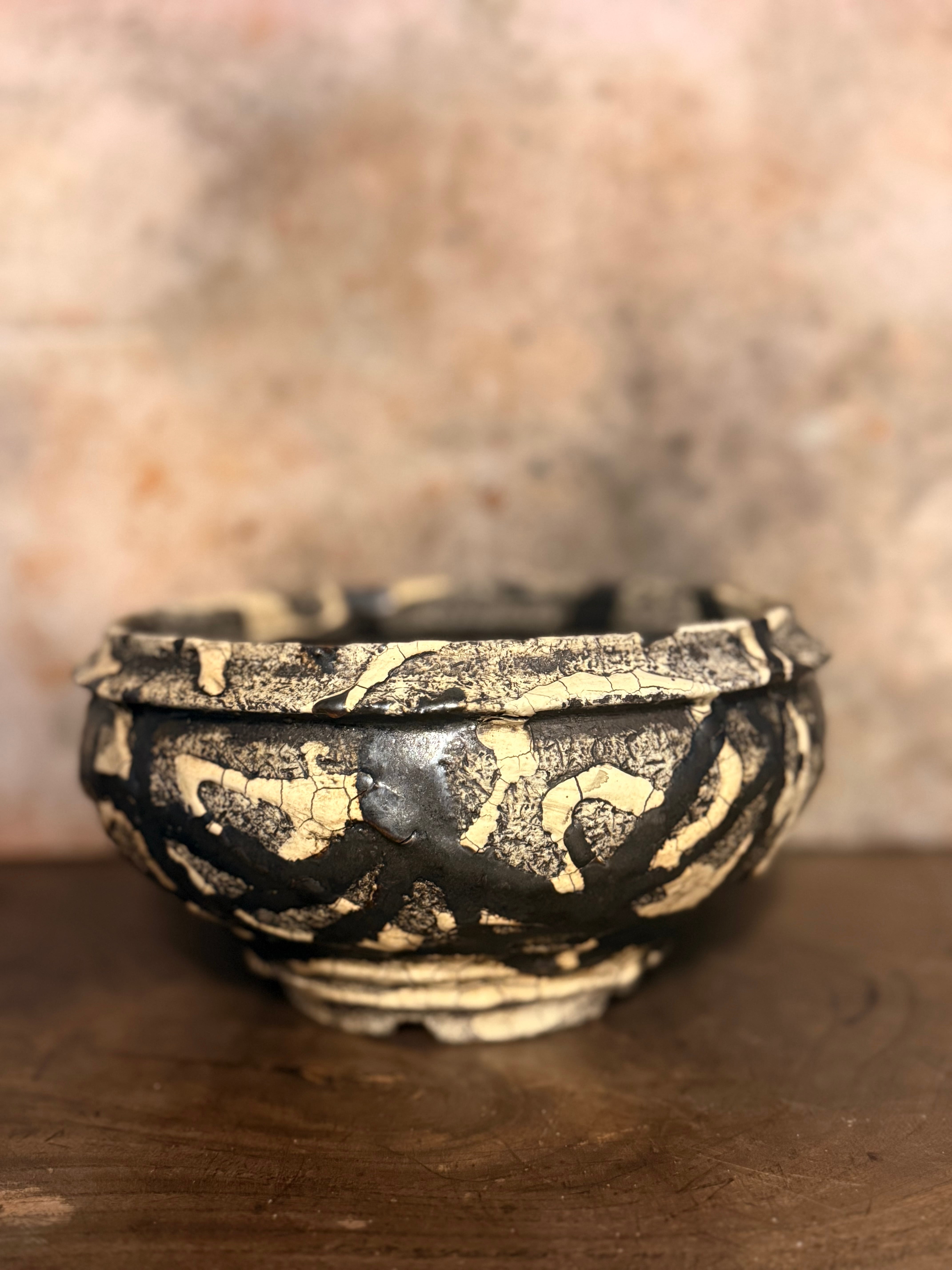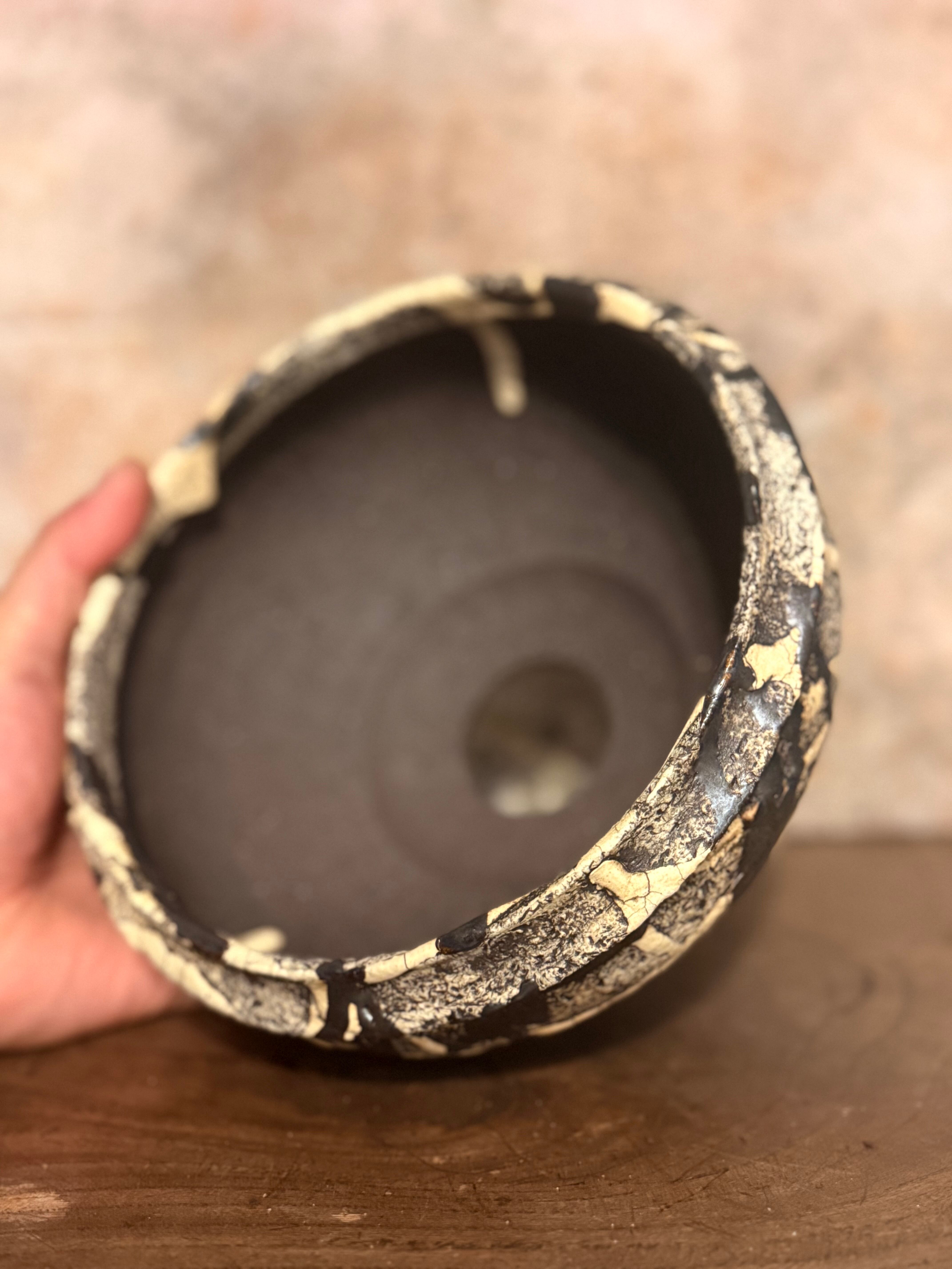 白と黒の釉薬を折り重ねて「蔓-kazura-」を表現しました。